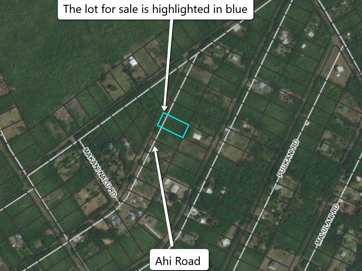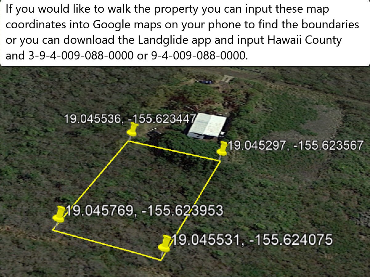 To view the property you’ll need to put in Ahi Road Pahoa Hawaii into your navigation system. When you get on the street you can find the property by either using the map coordinates on the pictures from the listings or you can use a phone app called Landglide. You’ll need to input in Hawaii County and Parcel #9-4-009-088-0000. After you do this you’ll need to switch it to satellite mode to make it easier for you to find. This app will highlight the property and show a blue dot representing where you are located on the property. If you have specific questions on what can be placed on this lot, please call the building and zoning department of Hawaii County at 808 323 4770.