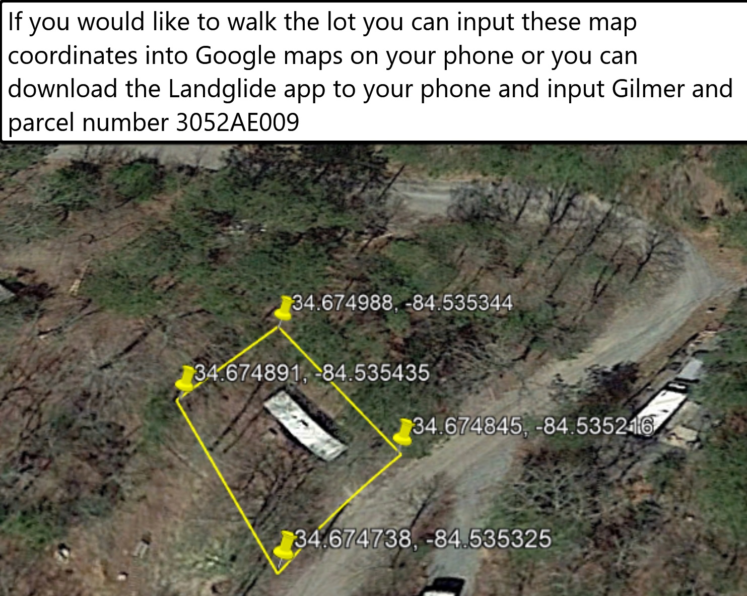 The property Parcel number is 3052AE009. If you are interested in a walk-though of this property, contact Terry Ledford at 706 455 2503, for gate entrance. For a more accurate assessment of the boundaries please download the Landglide app to your phone. If you have specific questions on HOA regulations, please call the Homeowners Association at 706 276 1060, or you can visit https://mycrra.com/.
